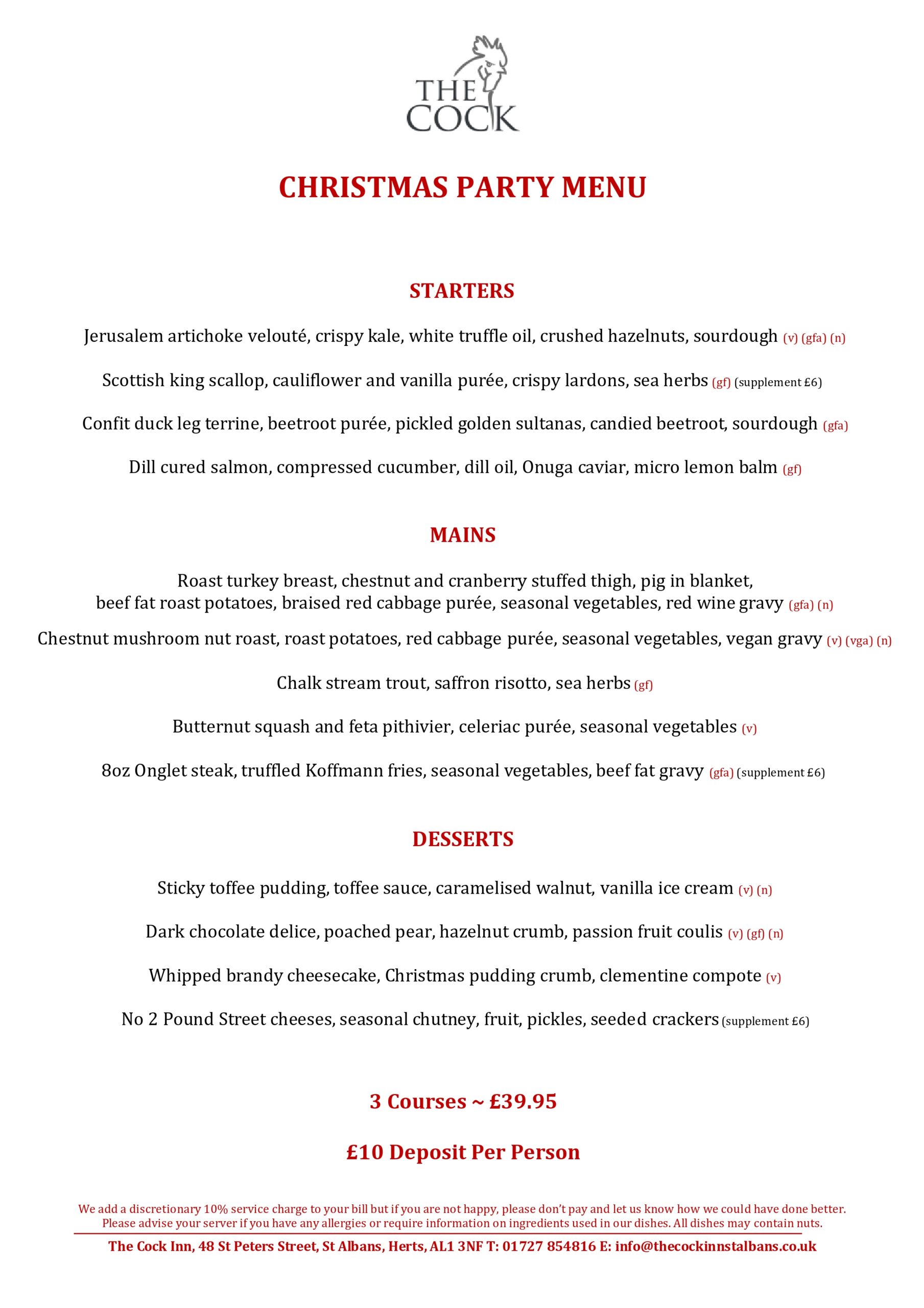 3 courses for £39.95, £10 deposit per person.