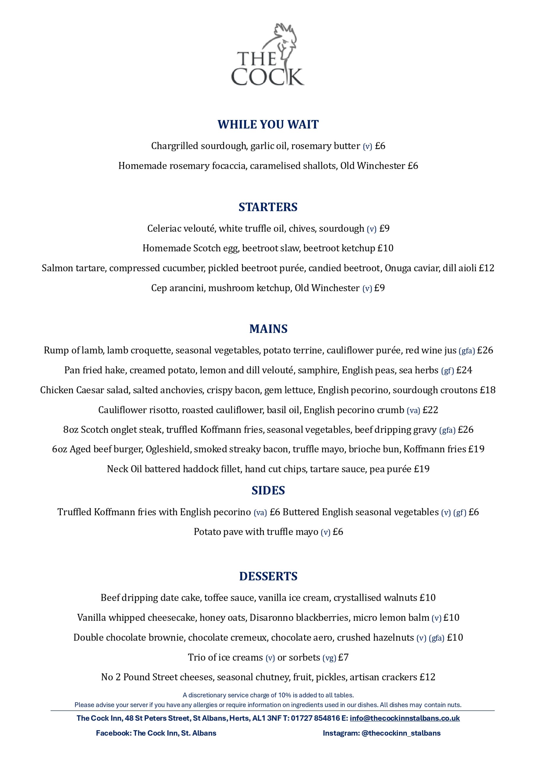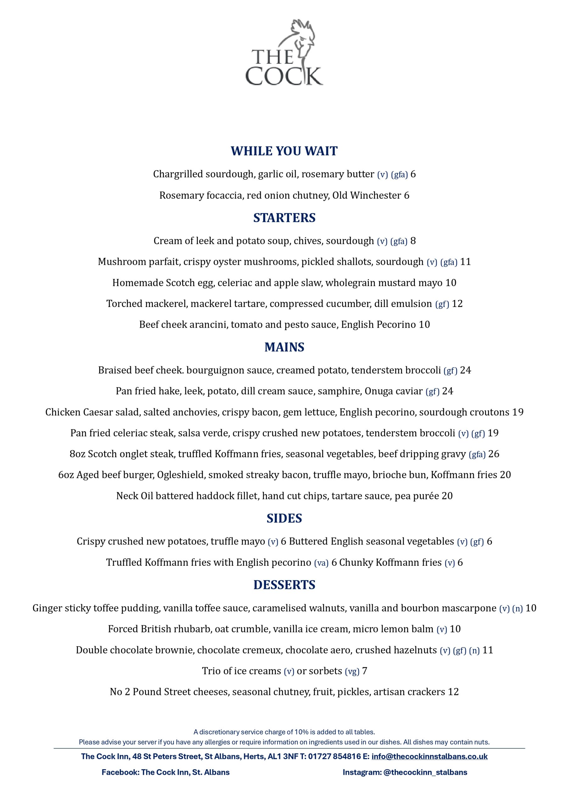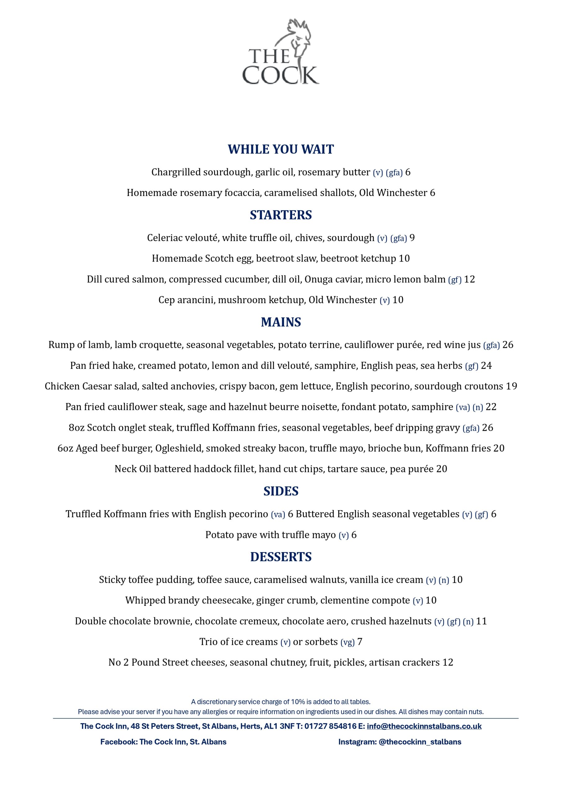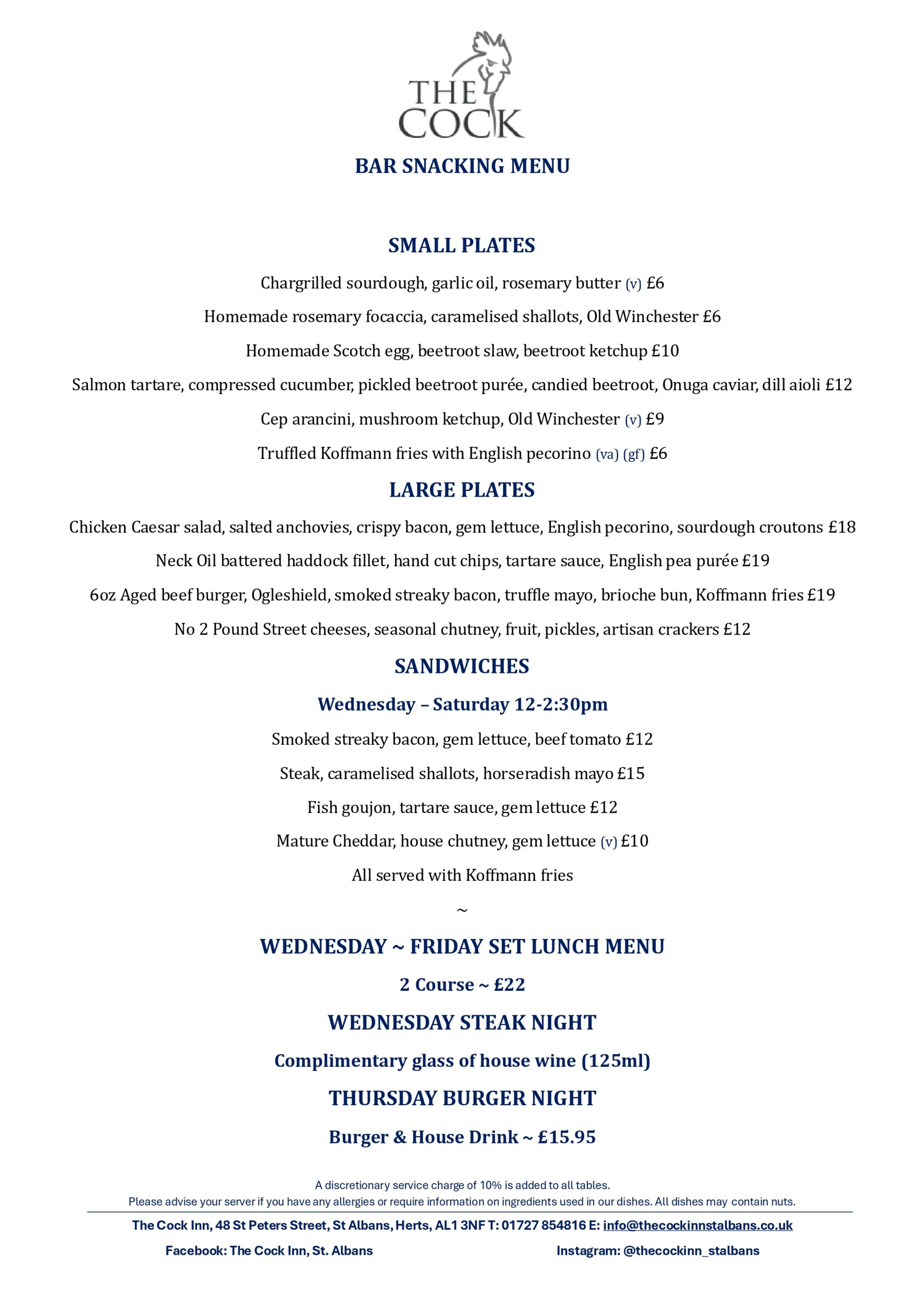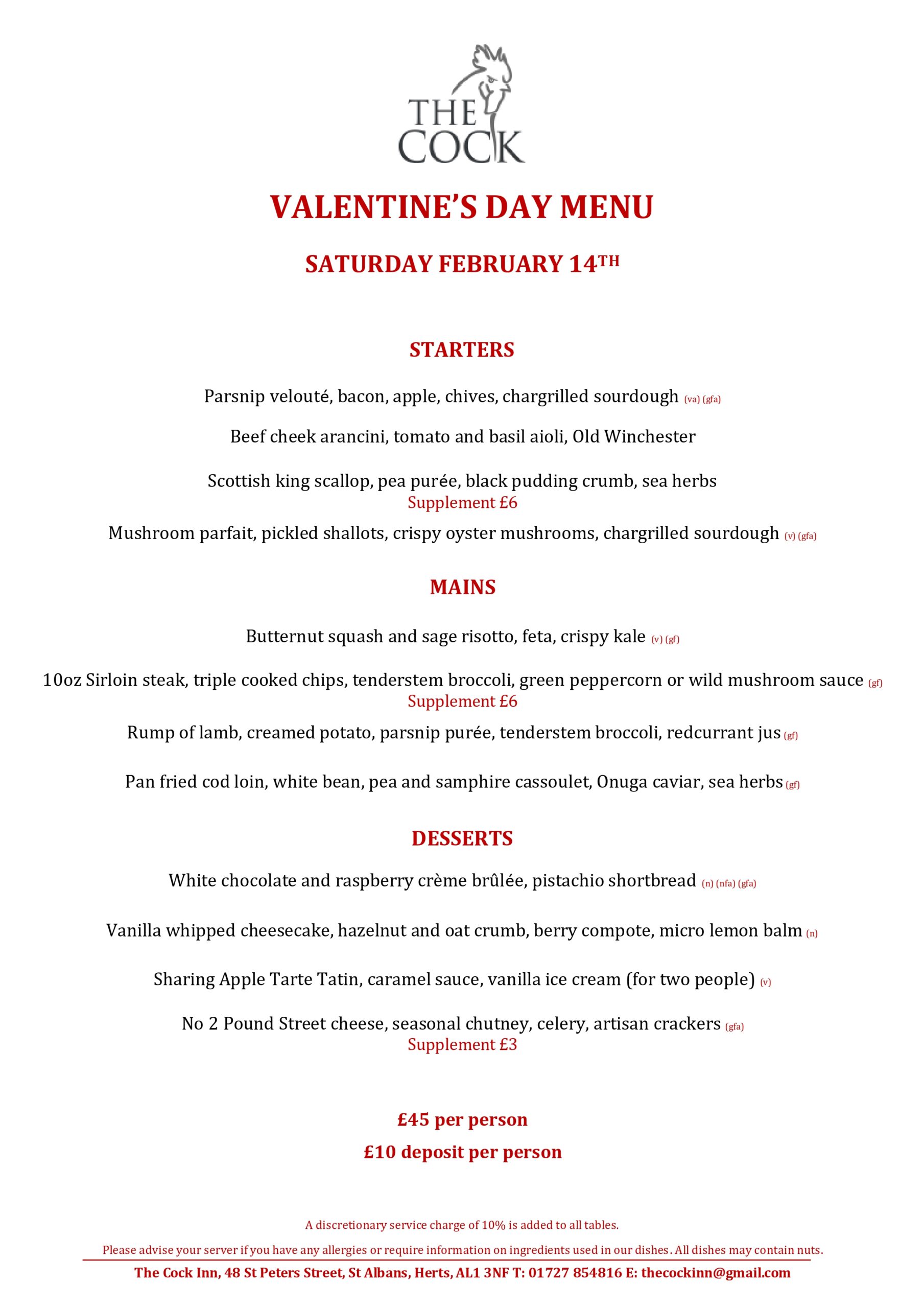 Please book online for tables of up to 5 people. For tables of 6 or more, please email info@thecockinnstalbans.co.uk. Please note that as we have a small restaurant, a deposit of £10 per person is required for tables of six or more.