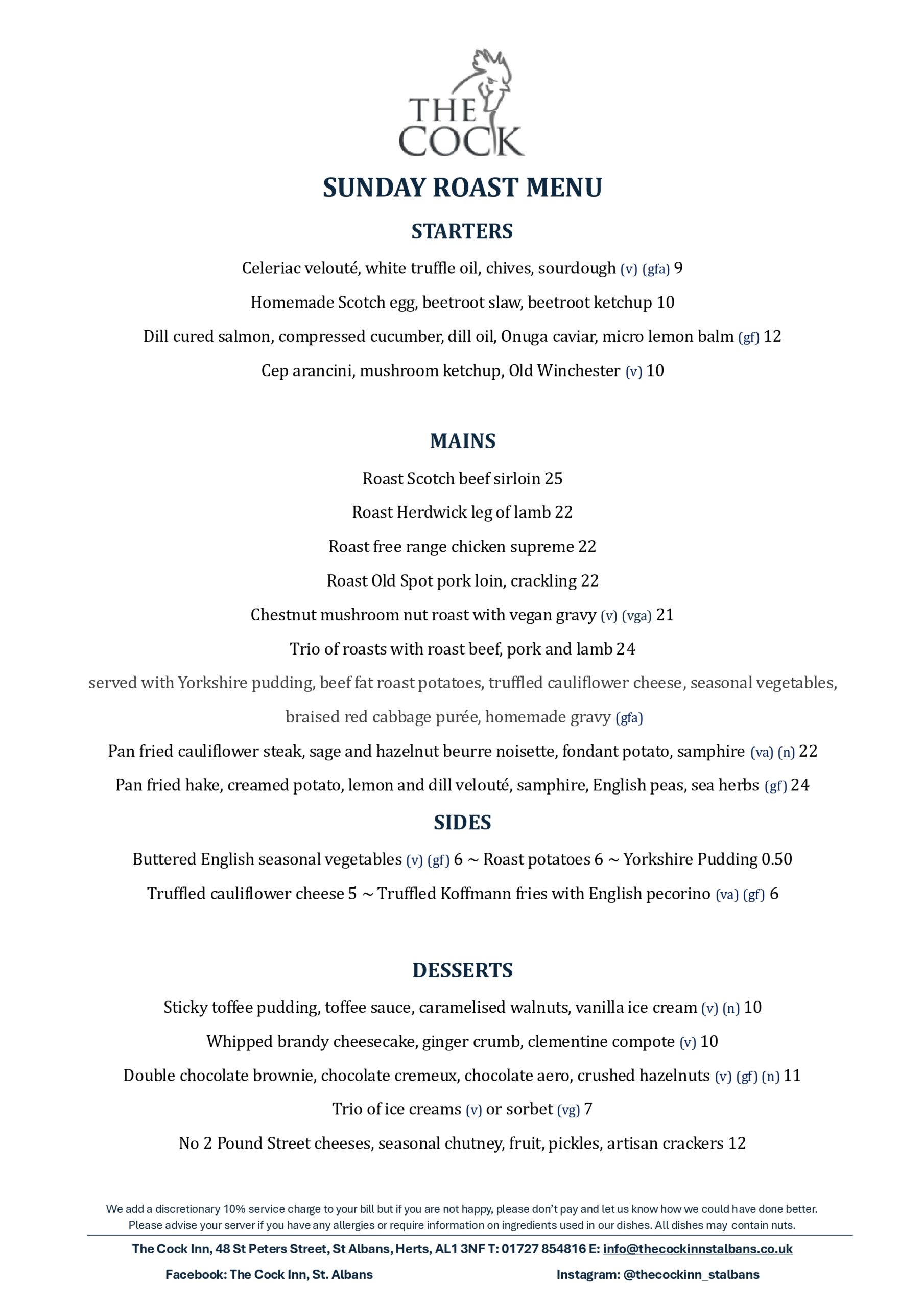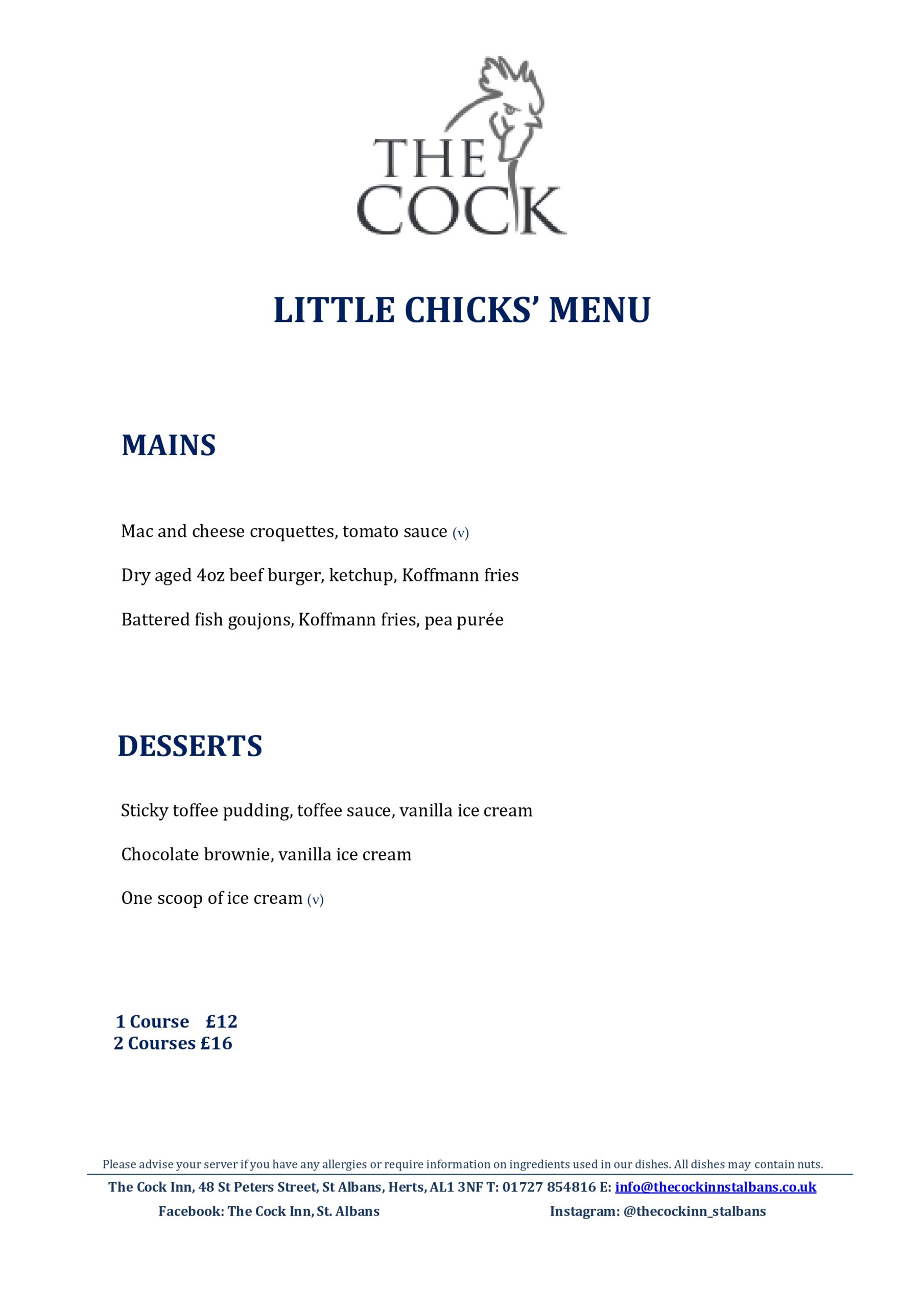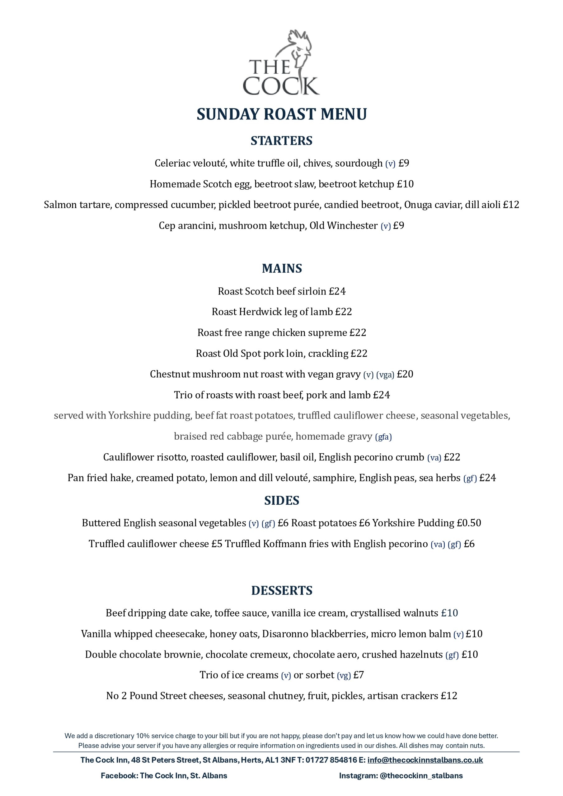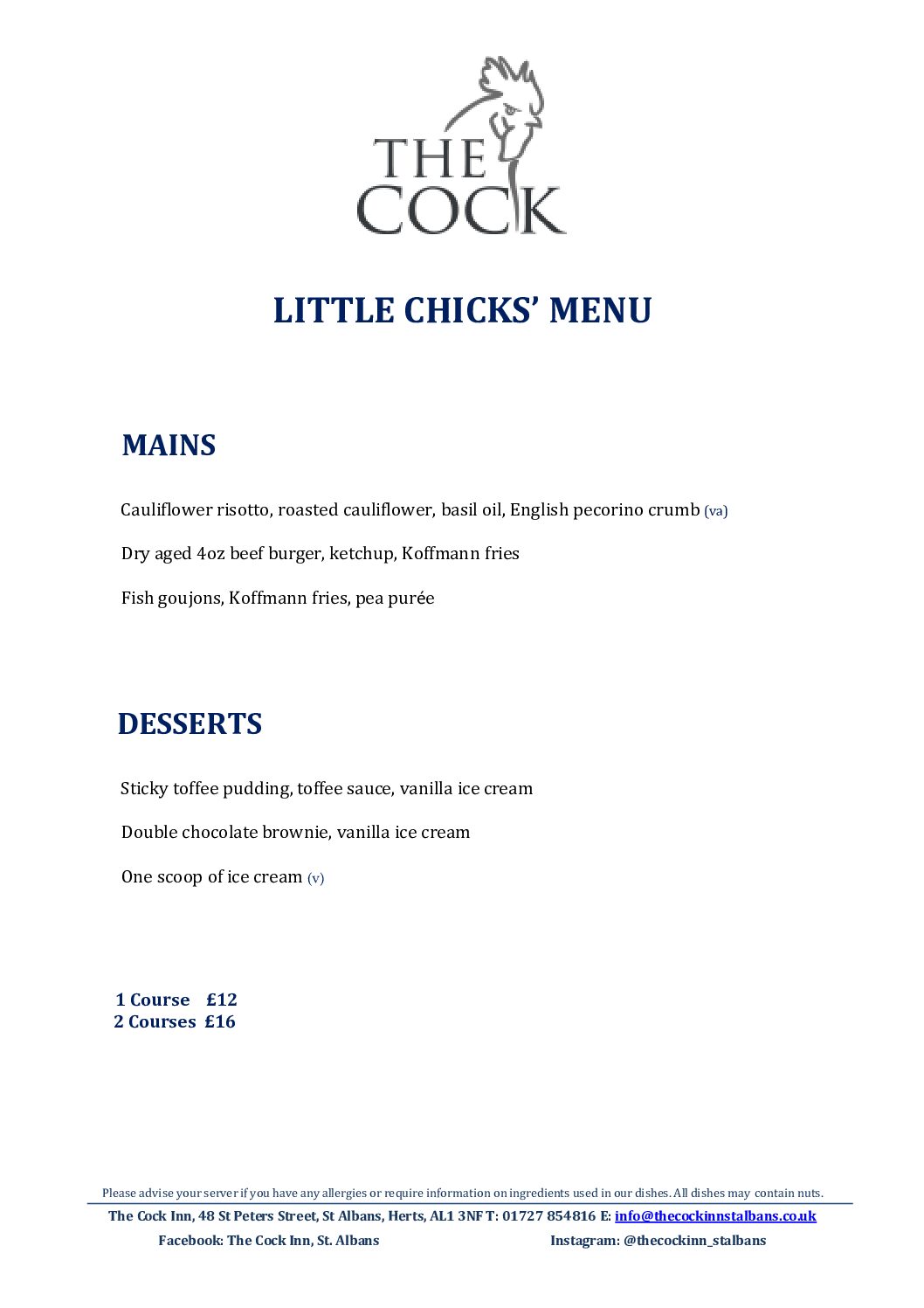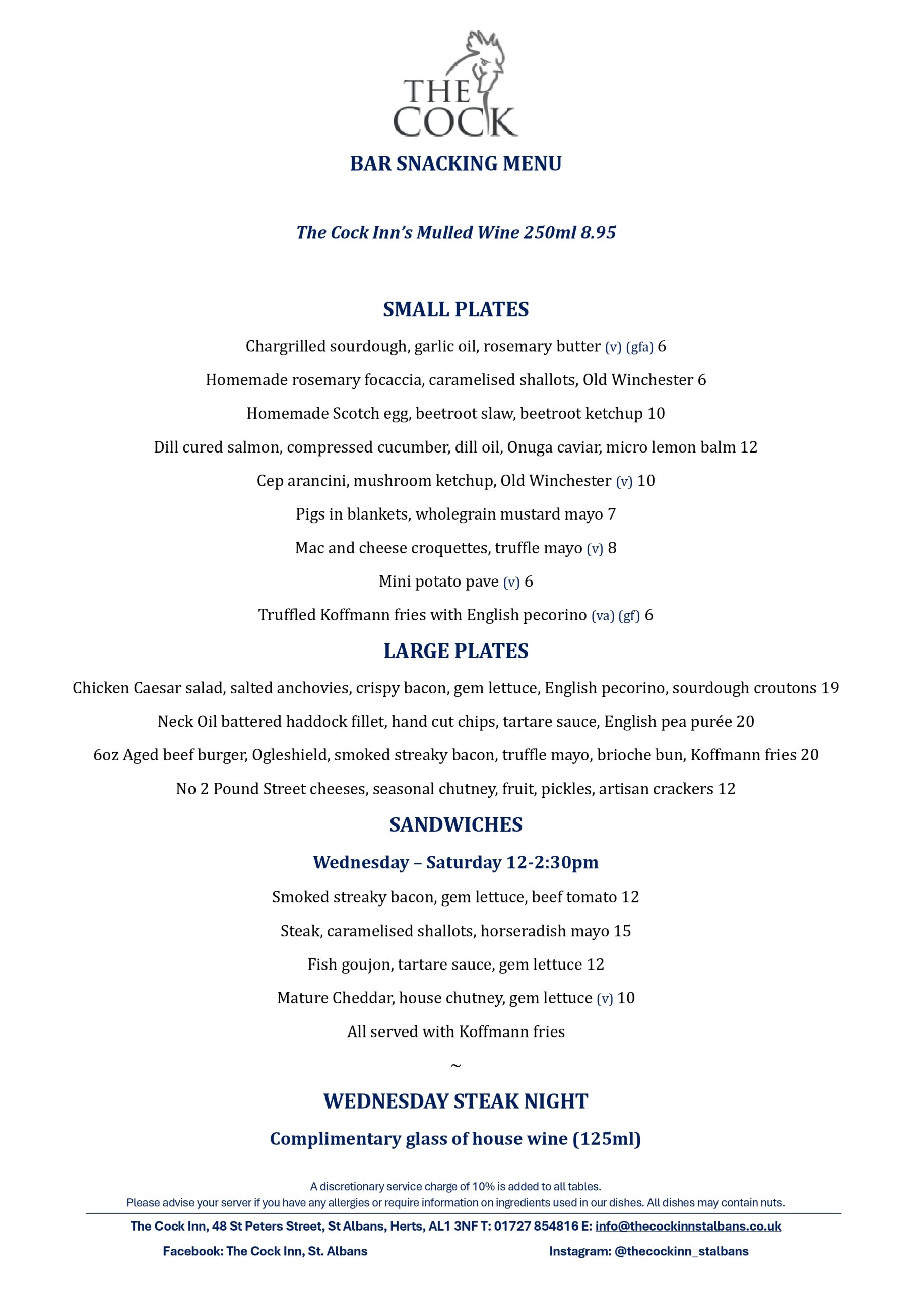 Please book online for tables of up to 5 people. For tables of 6 or more, please email info@thecockinnstalbans.co.uk. Please note that as we have a small restaurant, a deposit of £10 per person is required for tables of six or more.