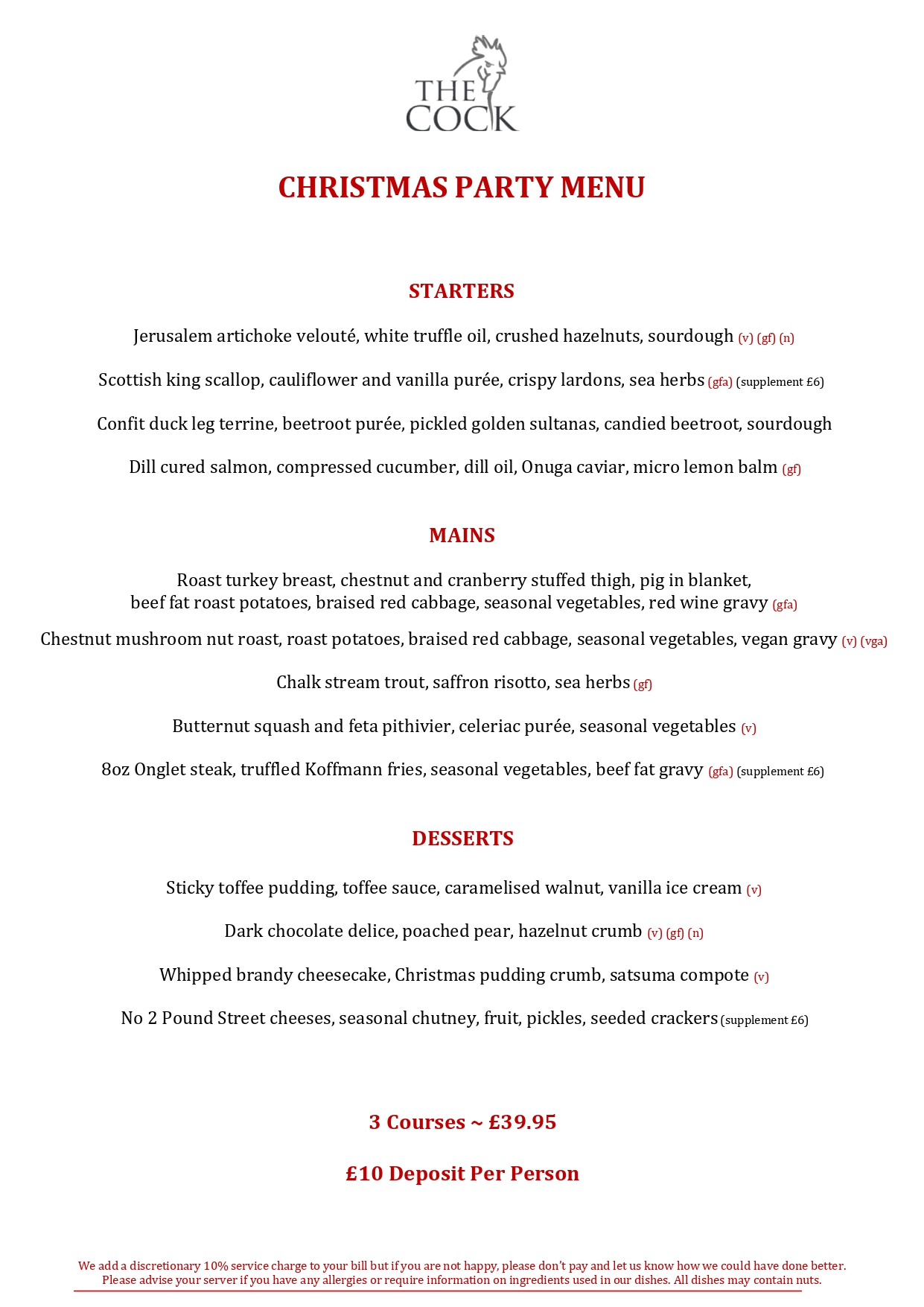Our 3 Course Christmas Party Menu is available from Thursday November 27th until Wednesday December 24th (£39.95 per person). A deposit of £10 per person is required. A Pre Order Form will be emailed to all confirmed reservations. Please note that we are closed on Christmas Day to give our team a day with their families.